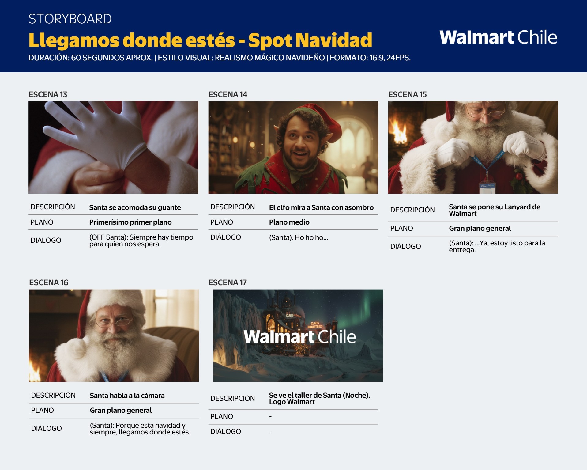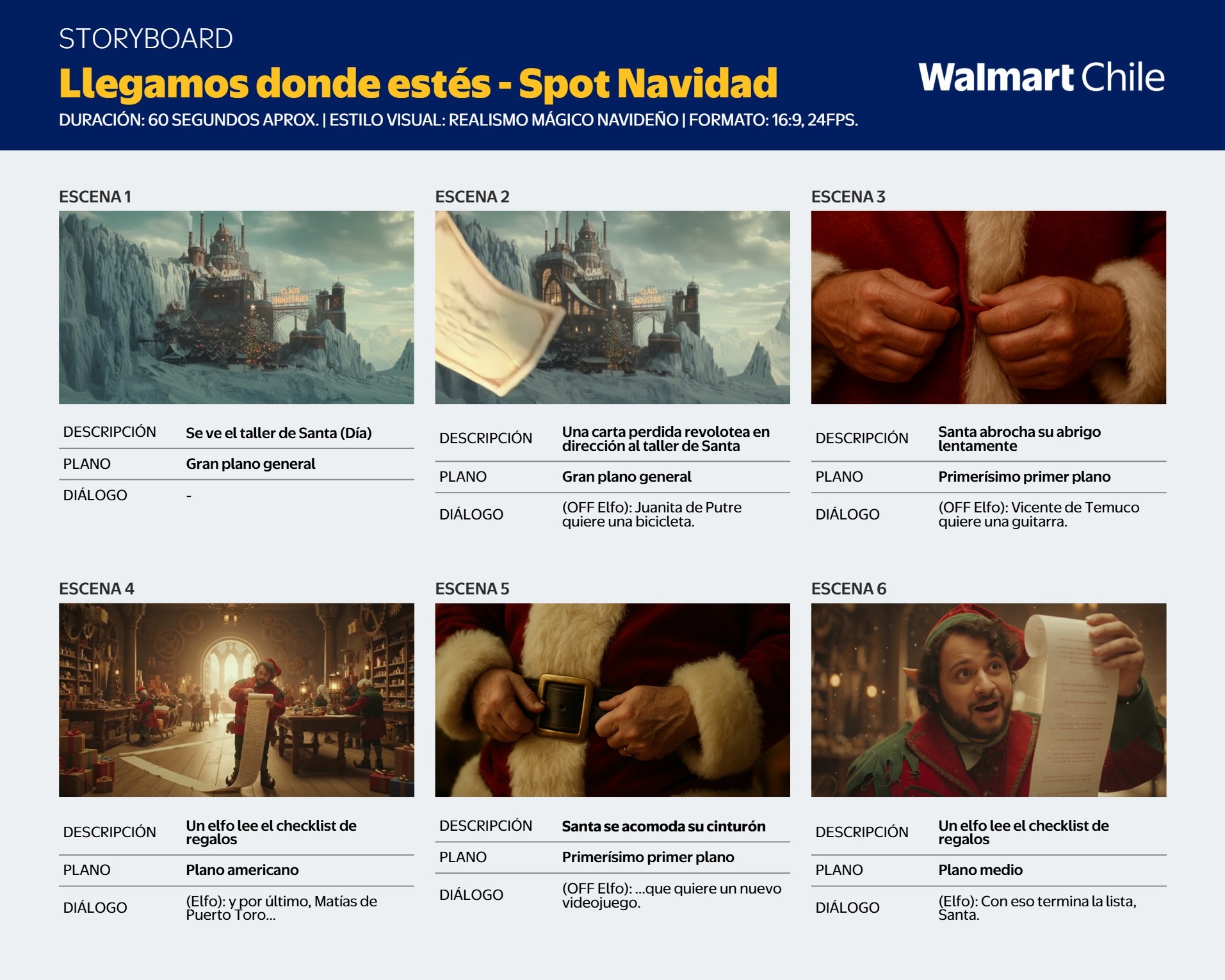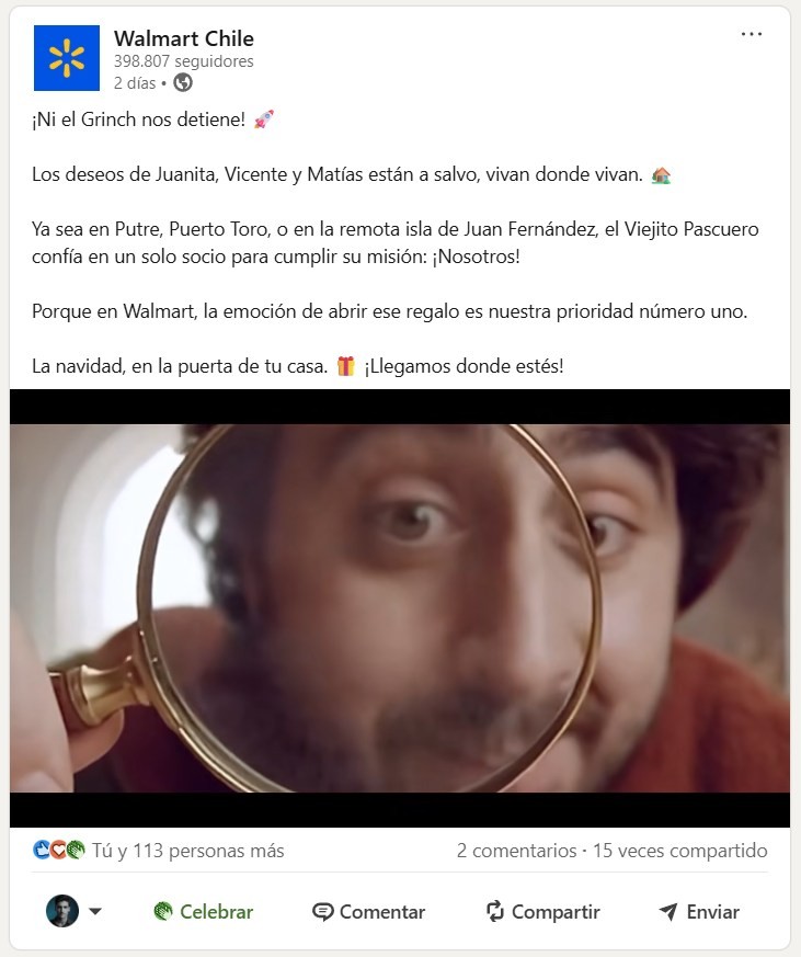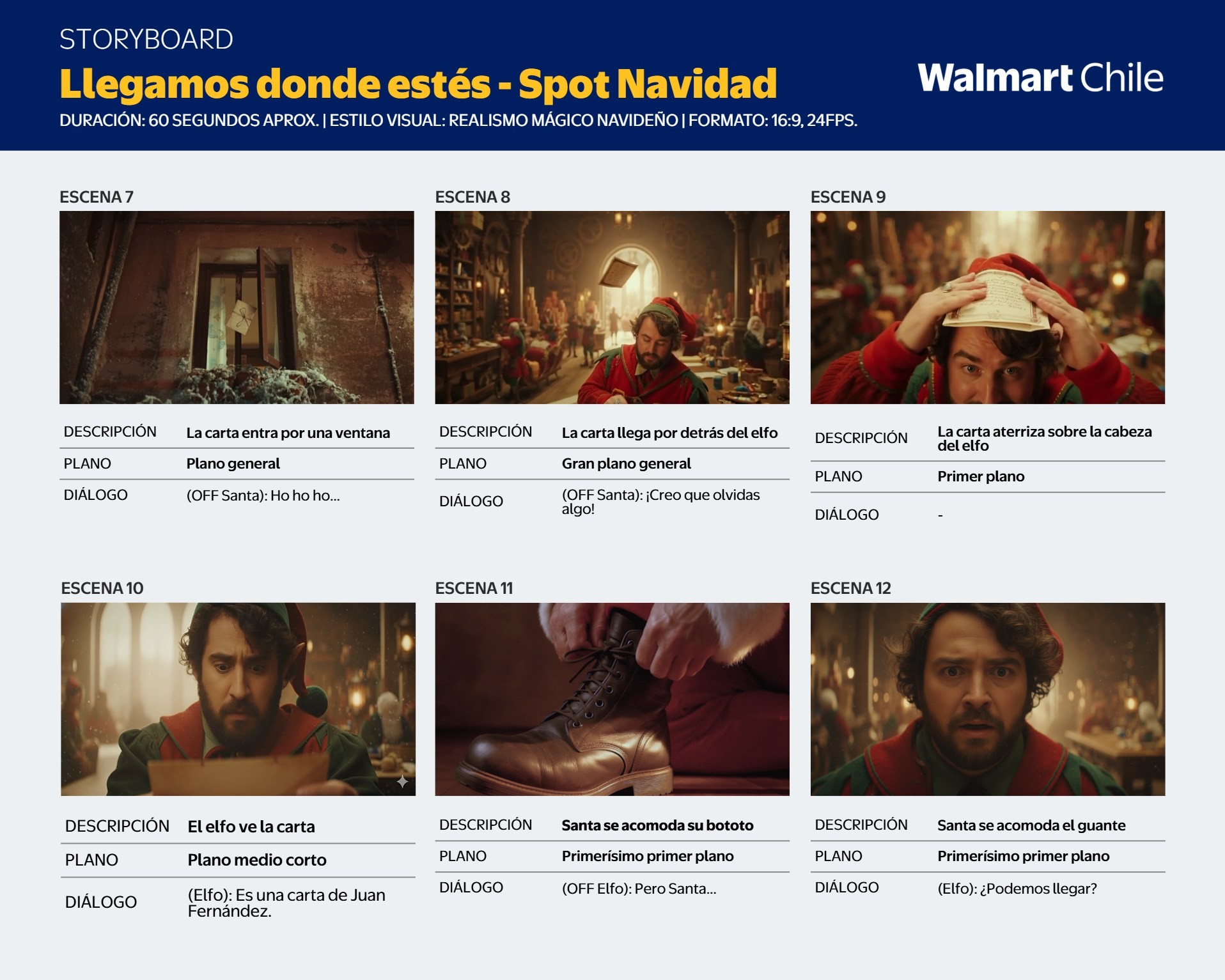 De pronto, una última carta perdida entra revoloteando por la ventana; al percatarse de que proviene de Juan Fernández, el ayudante duda de si podrán llegar hasta allá, pero Santa, ajustándose su traje y colgándose su Lanyard de Walmart Chile, responde con una certeza cálida y poderosa:
